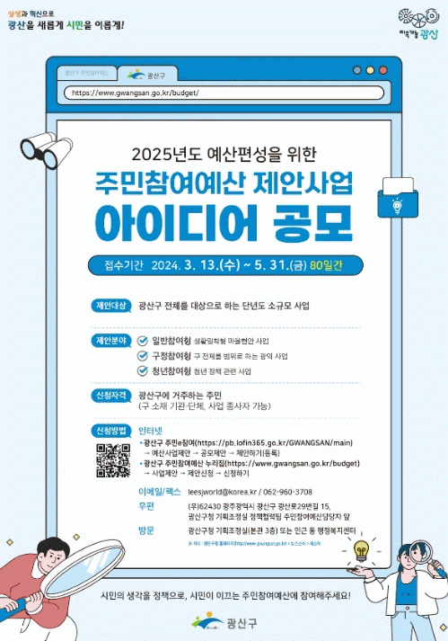 [¹Ìµð¾îÀü³² ±èÁ¤¿ì ±âÀÚ]±¤ÁÖ±¤¿ª½Ã ±¤»ê±¸´Â ½Ã¹ÎÀÌ ÁÖµµÇØ ´Ù¾çÇÑ »ý°¢À» ±¸ÇöÇÏ´Â ÁÖ¹ÎÂü¿©¿¹»ê »ç¾÷À» ¹ß±¼Çϱâ À§ÇØ 2025³âµµ ¡®ÁÖ¹ÎÂü¿©¿¹»ê Á¦¾È»ç¾÷ ¾ÆÀ̵ð¾î¡¯¸¦ °ø¸ðÇÑ´Ù°í ¹àÇû´Ù. °ø¸ð ±â°£Àº 5¿ù 31ÀϱîÁö¸ç, ±¤»ê±¸ ÁֹΡ¦
