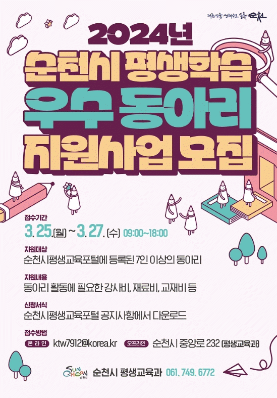 [¹Ìµð¾îÀü³² ÀÓ¼º¿Ï ±âÀÚ]¼øÃµ½Ã°¡ ¿À´Â 25ÀϺÎÅÍ 27ÀϱîÁö¡®2024³â Æò»ýÇнÀ ¿ì¼ö µ¿¾Æ¸® Áö¿ø »ç¾÷¡¯¿¡ Âü¿©ÇÒ µ¿¾Æ¸®¸¦ ¸ðÁýÇÑ´Ù°í ¹àÇû´Ù. Æò»ýÇнÀ µ¿¾Æ¸®´Â ÇнÀÀ» ÁÖµÈ ¸ñÀûÀ¸·Î Âü¿©ÇÏ´Â ¸ðÀÓÀ¸·Î¼, Á¤±âÀûÀÎ ÇнÀ°ú ½ÇõÀ» Å롦
