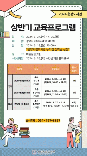 [¹Ìµð¾îÀü³² ÀÓ¼º¿Ï ±âÀÚ]±¤¾ç¿ë°µµ¼°üÀº ¿À´Â 27ÀϺÎÅÍ 4¿ù 20ÀϱîÁö Áö¿ª ³» ¾î¸°ÀÌ(À¯¾Æ 6~7¼¼)¿Í ÃʵîÇлý(1~3Çгâ)À» ´ë»óÀ¸·Î ¡®»ó¹Ý±â ±³À° ÇÁ·Î±×·¥¡¯À» ¿î¿µÇÑ´Ù. °³¼³ ÇÁ·Î±×·¥Àº ¡®¿µ¾î¡¯¿Í ¡®µ¶¼¡¯ °ÁÂÀÌ´Ù. ¿µ¾î °Á´¡¦