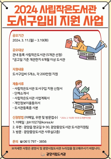 [¹Ìµð¾îÀü³² ÀÓ¼º¿Ï ±âÀÚ]±¤¾ç½Ã´Â ÀÌ´Þ 11ÀϺÎÅÍ 19ÀϱîÁö '2024³â »ç¸³ÀÛÀºµµ¼°ü µµ¼±¸ÀÔºñ Áö¿ø »ç¾÷'¿¡ Âü¿©ÇÒ Áö¿ª ³» »ç¸³ÀÛÀºµµ¼°üÀ» ¸ðÁýÇÑ´Ù°í ¹àÇû´Ù. º» »ç¾÷Àº »ç¸³ÀÛÀºµµ¼°ü¿¡ ½Å°£ µµ¼ È®ÃæÀ» À§ÇÑ µµ¼±¸ÀÔºñ¸¦ Áö¿ø¡¦