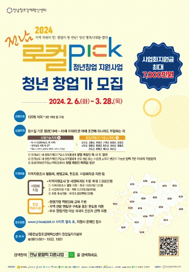 [¹Ìµð¾îÀü³² Á¦°¥´ëÁ¾ ±âÀÚ]Àü¶ó³²µµ´Â Áö¿ª ÀÚ¿øÀ» Ȱ¿ëÇÑ Ã»³ââ¾÷À» Áö¿øÇØ ÀÏÀÚ¸®¸¦ âÃâÇϰí Áö¿ª¿¡ Ȱ·ÂÀ» ºÒ¾î³Ö±â À§ÇØ ¡®2024³â Àü³² ·ÎÄÃÇÈ(Local Pick) û³ââ¾÷ Áö¿ø»ç¾÷¡¯À» ÃßÁøÅ°·Î Çϰí, ¿À´Â 28ÀϱîÁö Âü¿©ÀÚ¸¦ ¸ðÁýÇÑ´Ù¡¦