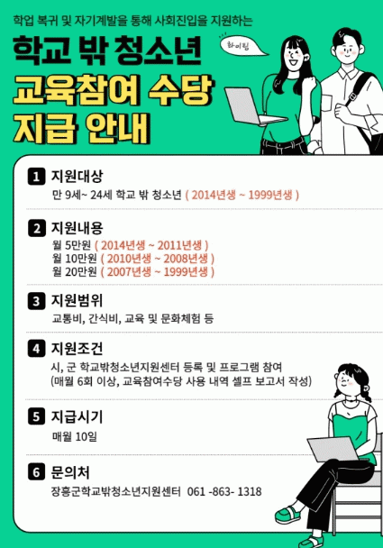 [¹Ìµð¾îÀü³² Á¦°¥´ëÁ¾ ±âÀÚ] ÀåÈﱺÇб³¹Ûû¼Ò³âÁö¿ø¼¾ÅÍ ²Þµå¸²Àº ¸¸ 9¼¼ ºÎÅÍ 24¼¼ Çб³ ¹Û û¼Ò³âÀ» ´ë»óÀ¸·Î ±³À°Âü¿©¼ö´çÀ» Áö±ÞÇϰí ÀÖ´Ù. ±³À°Âü¿©¼ö´çÀº 2021³âºÎÅÍ Áö±ÞÇØ¿À°í ÀÖÀ¸¸ç, Áö¼ÓÀûÀÎ ÇÁ·Î±×·¥ ¿î¿µ°ú »ç·Ê°ü¸®·Î ¸Å¡¦