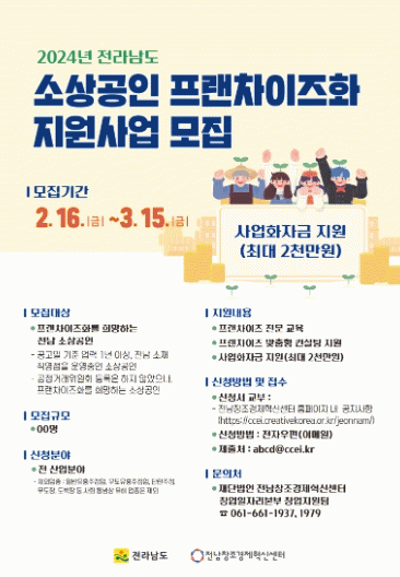 [¹Ìµð¾îÀü³² Á¦°¥´ëÁ¾ ±âÀÚ]Àü¶ó³²µµ´Â 2024³â ¼Ò»ó°øÀÎ ÇÁ·£Â÷ÀÌÁîÈ Áö¿ø»ç¾÷¿¡ Âü¿©ÇÒ ±â¾÷À» ¿À´Â 15ÀϱîÁö ¸ðÁýÇÑ´Ù°í ¹àÇû´Ù. Àü³²µµ¿Í Àü³²Ã¢Á¶°æÁ¦Çõ½Å¼¾ÅͰ¡ ÃßÁøÇÏ´Â ¼Ò»ó°øÀÎ ÇÁ·£Â÷ÀÌÁîÈ Áö¿ø»ç¾÷Àº Àü³²ÀÇ À¯¸Á ¼Ò»ó°øÀÎÀ»¡¦