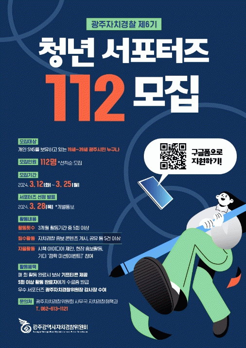 [¹Ìµð¾îÀü³² Á¦°¥´ëÁ¾ ±âÀÚ]±¤ÁÖ±¤¿ª½ÃÀÚÄ¡°æÂûÀ§¿øÈ¸´Â ÀÚÄ¡°æÂû ºÐ¾ß ¿Â¶óÀÎ È«º¸¿Í ¸ÂÃãÇü Ä¡¾È½ÃÃ¥ ¹ß±¼À» À§ÇØ ¡®Á¦6±â û³â ¼Æ÷ÅÍÁ¸¦ ¸ðÁýÇÑ´Ù. ¼Æ÷ÅÍÁî´Â ¿À´Â 4¿ù 1ÀϺÎÅÍ 6¿ù 30ÀϱîÁö »çȸ°ü°è¸Á¼ºñ½º(SNS)¿Í ¿¬°èÇÑ ¡¦