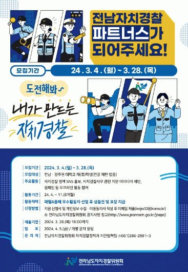 [¹Ìµð¾îÀü³² Á¦°¥´ëÁ¾ ±âÀÚ]Àü¶ó³²µµÀÚÄ¡°æÂûÀ§¿øÈ¸°¡ ÀÚÄ¡°æÂûÀ» È«º¸Çϰí Ä¡¾È ¼ºñ½º¸¦ ÇÔ²² ¸¸µé¾î °¥ Àü³²ÀÚÄ¡°æÂû ÆÄÆ®³Ê½º¸¦ ¿À´Â 28ÀϱîÁö ¸ðÁýÇÑ´Ù. ÀÚÄ¡°æÂû ÆÄÆ®³Ê½º´Â ´Ù¾çÇÑ ¾ÆÀ̵ð¾î¸¦ Ȱ¿ëÇØ ÀÚÄ¡°æÂû È«º¸ÄÜÅÙÃ÷¸¦ Á¦ÀÛ¡¦