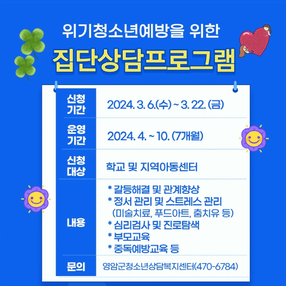 [¹Ìµð¾îÀü³² °í±Ô¼® ±âÀÚ]¿µ¾Ï±ºÃ»¼Ò³â»ó´ãº¹Áö¼¾ÅͰ¡ 4~10¿ù À§±â û¼Ò³â ¿¹¹æ Áý´Ü»ó´ãÇÁ·Î±×·¥À» ¿î¿µÇÑ´Ù. ÃÊ¡¤Áß¡¤°í±³¿Í Áö¿ª¿µ¾Æµ¿¼¾ÅÍ µî û¼Ò³â±â°üÀÌ ½ÅûÇÒ ¼ö ÀÖ´Â À̹ø Áý´ÜÇÁ·Î±×·¥Àº, °¥µîÇØ°á ¹× °ü°èÇâ»ó, Á¤¼°ü¸® ¹×¡¦