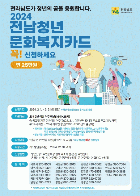 [¹Ìµð¾îÀü³² Á¦°¥´ëÁ¾ ±âÀÚ]¿µ±¤±ºÀº 3¿ù 1ÀϺÎÅÍ 31ÀϱîÁö ÇÑ ´Þ°£ 2024³â Àü³²Ã»³â ¹®Èº¹ÁöÄ«µå Áö¿ø»ç¾÷ ´ë»óÀÚ¸¦ ¸ðÁýÇÑ´Ù. Áö¿ø´ë»óÀº ÇöÀç Áֹεî·Ï»ó ÁÖ¼Ò°¡ ¿µ±¤±ºÀ̸ç Àü³²¿¡ ÁÖ¼Ò¸¦ µÎ°í 2³â ÀÌ»ó °ÅÁÖÇÑ 19~28¼¼(1996³â~200¡¦