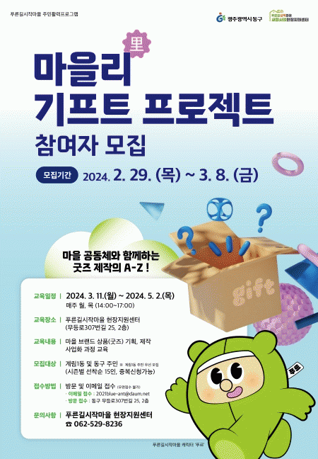 [¹Ìµð¾îÀü³² ±èÁ¤¿ì ±âÀÚ]±¤ÁÖ µ¿±¸´Â °è¸²1µ¿ Ǫ¸¥±æ½ÃÀÛ¸¶À» »õ¶ã»ç¾÷ ÀÏȯÀ¸·Î ÁֹΠÁÖµµ ¸¶À» ºê·£µå ±¸ÃàÀ» À§ÇÑ ¡®¸¶À»¸®(×ì) ±âÇÁÆ® ÇÁ·ÎÁ§Æ®¡¯ Âü°¡ÀÚ 15¸íÀ» ¿À´Â 8ÀϱîÁö ¼±Âø¼ø ¸ðÁýÇÑ´Ù°í ¹àÇû´Ù. ¡®¸¶À»¸®(×â) ±âÇÁÆ® ÇÁ·Î¡¦