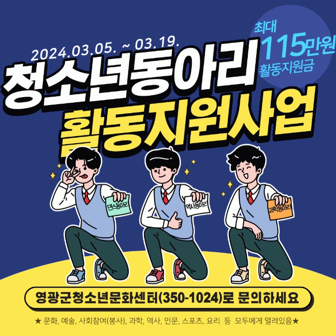 [¹Ìµð¾îÀü³² Á¦°¥´ëÁ¾ ±âÀÚ]¿µ±¤±ºÀº 3¿ù 5ÀÏ È¿äÀϺÎÅÍ 17ÀÏ È¿äÀϱîÁö '2024³â ¿µ±¤±º û¼Ò³âµ¿¾Æ¸® Ȱµ¿ Áö¿ø »ç¾÷'¿¡ Âü¿©ÇÒ Ã»¼Ò³âµ¿¾Æ¸®¸¦ ¸ðÁýÇÑ´Ù°í ¹àÇû´Ù. ¸ðÁý ´ë»óÀº °ü³» °ÅÁÖ 10¼¼~19¼¼ 10¸í ³»¿Ü·Î ±¸¼ºµÈ û¼Ò³âµ¿¾Æ¡¦