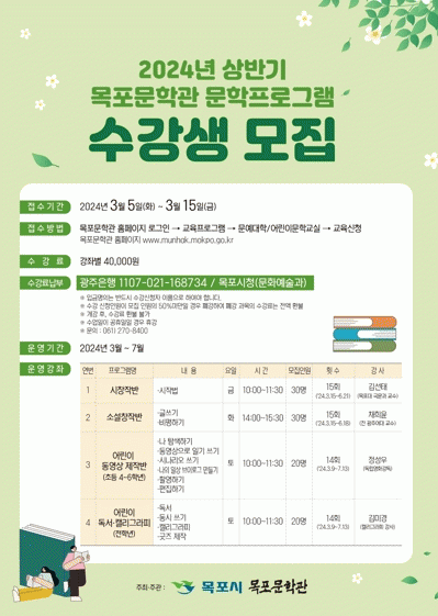[¹Ìµð¾îÀü³² °í±Ô¼® ±âÀÚ]¸ñÆ÷½Ã´Â ¸ñÆ÷¹®Çаü »ó¹Ý±â ±³À°ÇÁ·Î±×·¥À» 3¿ùºÎÅÍ 7¿ù±îÁö ¿î¿µÇÑ´Ù. ÁÖ¿ä °Á·δ ¡ã¼ºÀδë»ó ¹®¿¹´ëÇÐ ½Ã¡¤¼Ò¼³ âÀÛ¹Ý ¡ãÃʵîÇлý ´ë»ó ¾î¸°ÀÌ ¹®Çб³½Ç µ¿¿µ»ó Á¦ÀÛ¹Ý, µ¶¼¡¤Ä¶¸®±×¶óÇÇ·Î 4°³ ¹ÝÀÌ ¿î¡¦
