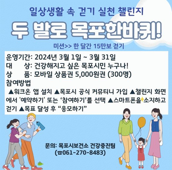 [¹Ìµð¾îÀü³² °í±Ô¼® ±âÀÚ]¸ñÆ÷½Ã º¸°Ç¼Ò°¡ °È±â¸¦ ÅëÇØ °Ç°ÇÑ Áö¿ª»çȸ ºÐÀ§±â¸¦ Á¶¼ºÇϰíÀÚ ÀÏ»ó ¼Ó °È±â ½Çõ ¸ð¹ÙÀÏ °È±â ¾Û ¿öÅ©¿ÂÀ» ÀÌ¿ë ¡®µÎ ¹ß·Î ¸ñÆ÷ÇѹÙÄû! °È±â縰Áö¡¯¸¦ 3¿ùºÎÅÍ ¿î¿µÇÑ´Ù. 縰Áö Âü¿© ¹æ¹ýÀº ¡ã¿öÅ©¿Â ¾Û¡¦