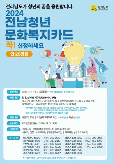 [¹Ìµð¾îÀü³² Á¦°¥´ëÁ¾ ±âÀÚ]Àü¶ó³²µµ´Â û³âÀÇ ¹®È¡¤¿©°¡ Ȱµ¿À» Áö¿øÇÏ´Â ¡®Ã»³â ¹®Èº¹ÁöÄ«µå¡¯ ½ÅûÀÚ¸¦ 3¿ùºÎÅÍ ¸ðÁýÇÑ´Ù°í ¹àÇû´Ù. ¡®Àü³²Ã»³â ¹®Èº¹ÁöÄ«µå¡¯´Â û³âÀÇ ¹®È ÇâÀ¯ ±âȸ È®´ë¿Í ÀÚ±â°è¹ß µîÀ» À§ÇØ 2022³âºÎÅÍ Áö¡¦