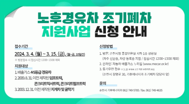 [¹Ìµð¾îÀü³² ÀÓ¼º¿Ï ±âÀÚ]¼øÃµ½Ã°¡ ³ëÈÄÇÑ °æÀ¯Â÷·®À» ÆóÂ÷ÇÒ ½Ã º¸Á¶±ÝÀ» Áö¿øÇÏ´Â 2024³â ³ëÈİæÀ¯Â÷ Á¶±âÆóÂ÷ Áö¿ø»ç¾÷À» 3¿ù 4ÀϺÎÅÍ ¿À´Â 3¿ù 15ÀϱîÁö ½Åû¹Þ´Â´Ù°í ¹àÇû´Ù. ƯÈ÷ ¿ÃÇØ¿¡´Â À۳⿡ Áö¿ø´ë»ó¿¡¼ Á¦¿ÜµÇ¾ú´ø 4µî±Þ ¡¦