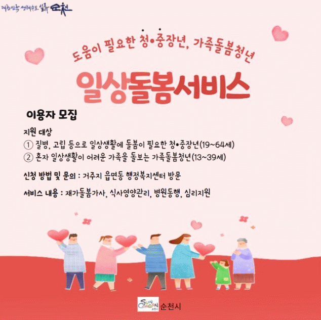 [¹Ìµð¾îÀü³² ÀÓ¼º¿Ï ±âÀÚ]¼øÃµ½Ã´Â 3¿ù 4ÀϺÎÅÍ µ¹º½ÀÌ ÇÊ¿äÇÑ Ã»¡¤ÁßÀå³â°ú °¡Á·µ¹º½Ã»³âÀ» ´ë»óÀ¸·Î¡®Àϻ󵹺½ ¼ºñ½º ÀÌ¿ëÀÚ¡¯¸¦ ¸ðÁýÇÑ´Ù°í ¹àÇû´Ù. Àϻ󵹺½ ¼ºñ½º´Â È¥ÀÚ¼ ÀÏ»ó»ýȰÀ» ¼öÇàÇϱ⠾î·Á¿î û¡¤ÁßÀå³â(19~64¼¼)°ú °¡¡¦