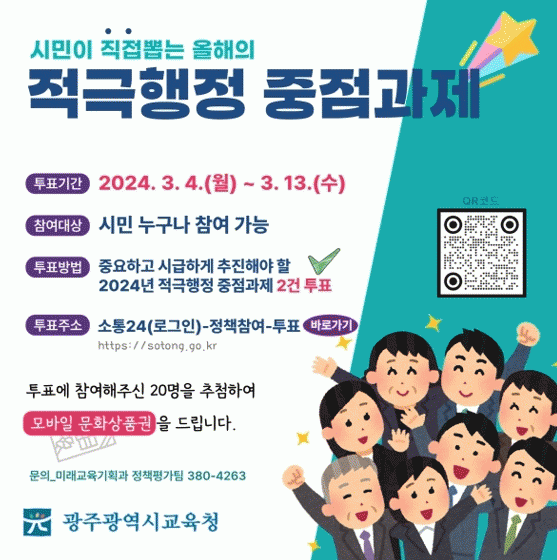 [¹Ìµð¾îÀü³² Á¦°¥´ëÁ¾ ±âÀÚ]±¤Áֽñ³À°Ã»ÀÌ 3¿ù 4ÀϺÎÅÍ 13ÀϱîÁö ½Ã¹Î ´©±¸³ª Âü¿© °¡´ÉÇÑ ¿Â¶óÀÎ ÅõÇ¥·Î ¡®2024³â Àû±ØÇàÁ¤ ÁßÁ¡°úÁ¦¡¯¸¦ ¼±Á¤ÇÑ´Ù. 3ÀÏ ½Ã±³À°Ã»¿¡ µû¸£¸é 2024³â Àû±ØÇàÁ¤ ÁßÁ¡°úÁ¦·Î 7°Ç »ç¾÷¿¡ ´ëÇÑ ¿Â¶óÀÎ ÅõÇ¥¸¦¡¦
