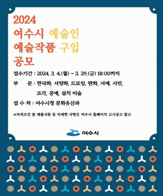 [¹Ìµð¾îÀü³² ÀüÇü¼º ±âÀÚ]¿©¼ö½Ã°¡ ¿©¼ö½Ã Áö¿ªÀÛ°¡µéÀÇ Ã¢ÀÛȰµ¿À» Áö¿øÇϱâ À§ÇØ ³»´Þ 3¿ù 29ÀϱîÁö ¡®Áö¿ª¿¹¼úÀÎ ÀÛǰ±¸ÀÔ °ø¸ð¡¯¸¦ ÁøÇàÇÑ´Ù. °ø¸ðºÐ¾ß´Â Çѱ¹È, ¼¾çÈ, ÆÇÈ, ¼¿¹, »çÁø, Á¶°¢, °ø¿¹ µî 9°³ ºÎ¹®ÀÌ´Ù. ÀÀ¸ð ÀÚ¡¦