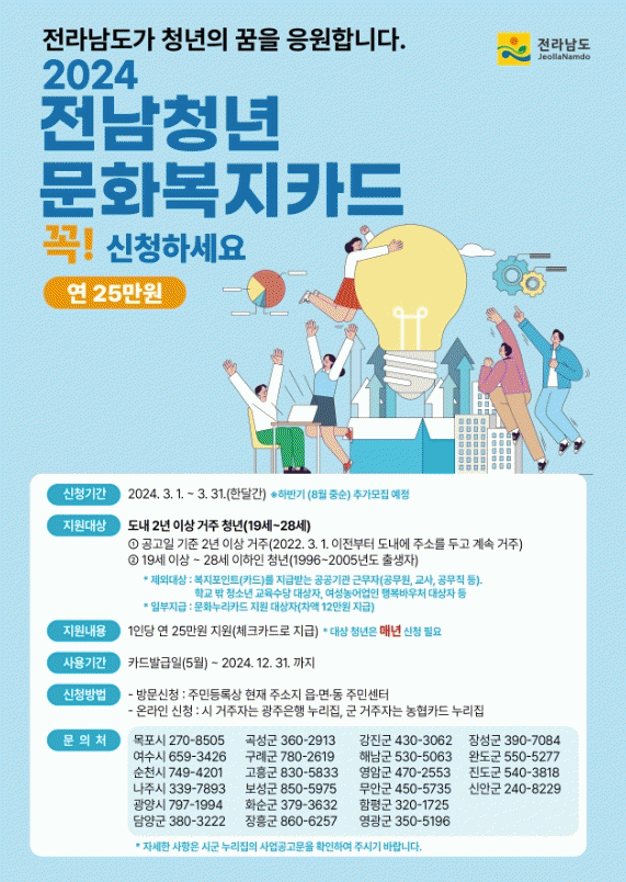 [¹Ìµð¾îÀü³² Á¦°¥´ëÁ¾ ±âÀÚ]ÀåÈﱺÀÌ 3¿ù ÇÑ ´Þ°£ ¡®2024³â Àü³²Ã»³â ¹®Èº¹ÁöÄ«µå Áö¿ø»ç¾÷¡¯ ´ë»óÀÚ¸¦ ¸ðÁýÇÑ´Ù. ¡®Àü³²Ã»³â ¹®Èº¹ÁöÄ«µå Áö¿ø»ç¾÷¡¯Àº û³âÀÇ ¹®È ÇâÀ¯¿Í Àڱ⠹ßÀü ±âȸ¸¦ Á¦°øÇϱâ À§ÇÑ ¹®Èº¹Áöºñ Áö¿ø»ç¾÷À¸·Î ¡¦