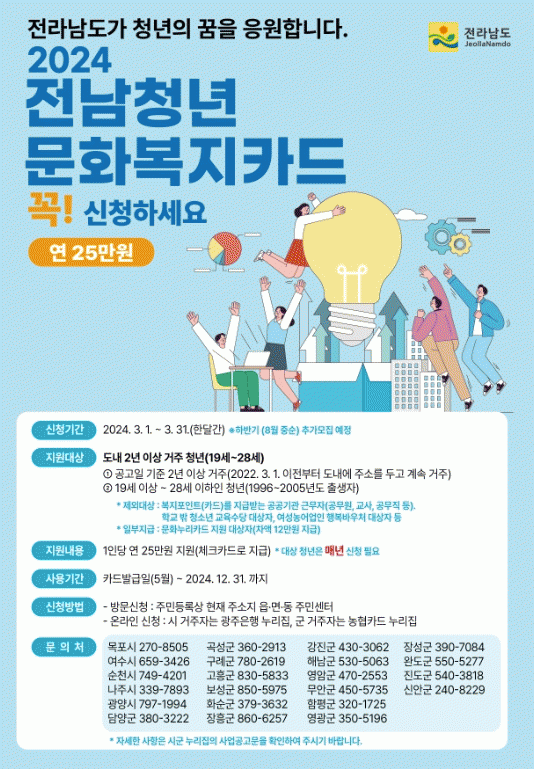 [¹Ìµð¾îÀü³² °í±Ô¼® ±âÀÚ]¸ñÆ÷½Ã´Â ¿À´Â 3¿ù 1ÀϺÎÅÍ 3¿ù 31ÀÏ ÇÑ ´Þ°£¡®Àü³²Ã»³â ¹®Èº¹ÁöÄ«µå Áö¿ø»ç¾÷¡¯´ë»óÀÚ¸¦ ¸ðÁýÇÑ´Ù. ¡®Àü³²Ã»³â ¹®Èº¹ÁöÄ«µå Áö¿ø»ç¾÷¡¯Àº Àü³²µµ¿Í ¸ñÆ÷½Ã°¡ ÈûÀ» ¸ð¾Æ û³âÀÇ ¹®ÈÇâÀ¯¿Í ÀÚ±â¹ßÀü ±âȸ¸¦ Á¦¡¦