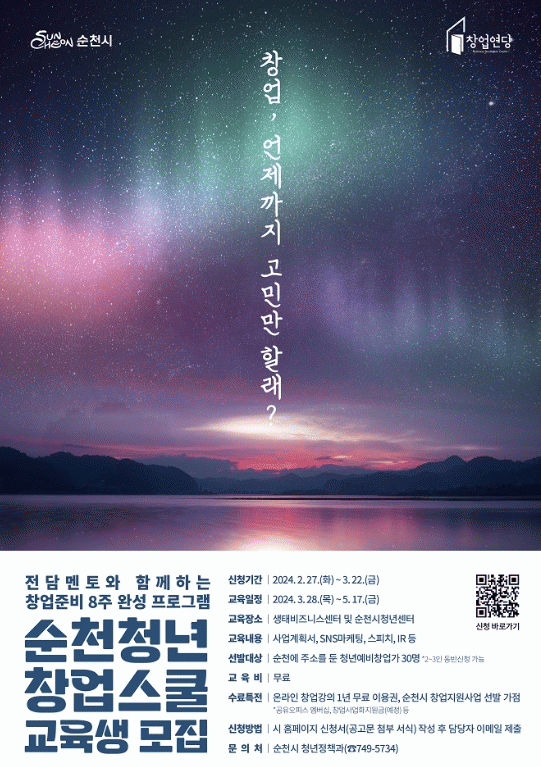 [¹Ìµð¾îÀü³² ÀÓ¼º¿Ï ±âÀÚ]¼øÃµ½Ã´Â 2¿ù 27ÀϺÎÅÍ 3¿ù 22ÀϱîÁö û³â¿¹ºñâ¾÷ÀÚµéÀ» À§ÇØ Ã¢¾÷±³À°ÇÁ·Î±×·¥ ¡°¼øÃµÃ»³ââ¾÷½ºÄ𡱿¡ Âü°¡ÇÒ ±³À°»ýÀ» ¸ðÁýÇÑ´Ù°í ¹àÇû´Ù. ¼øÃµÃ»³ââ¾÷½ºÄðÀº ¿¹ºñâ¾÷ÀÚµéÀÌ ²À ¾Ë¾Æ¾ß ÇÒ Ã¢¾÷±âÃʺÎÅÍ Á¤¡¦