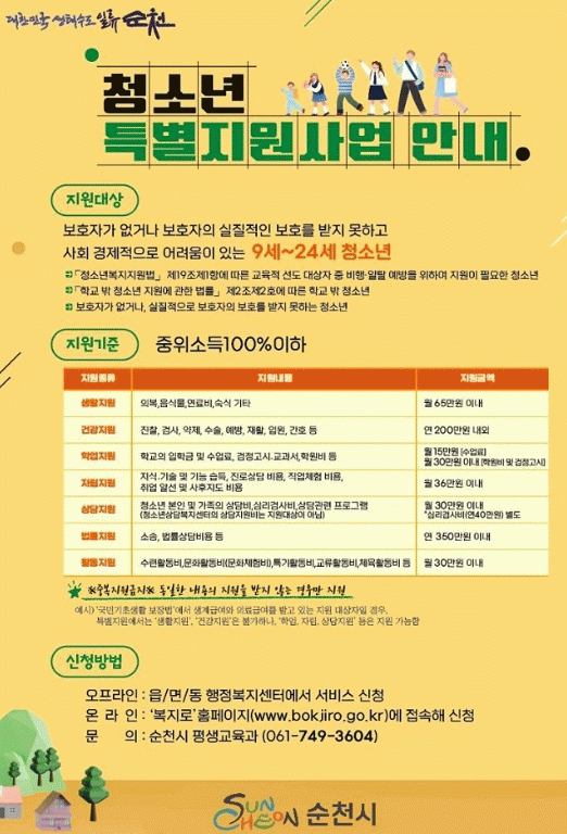 [¹Ìµð¾îÀü³² ÀÓ¼º¿Ï ±âÀÚ]¼øÃµ½Ã´Â û¼Ò³âÀÇ °Ç°ÇÑ ¼ºÀåÁö¿ø ¹× ÀÚ¸³À» Áö¿øÄÚÀÚ ¿À´Â 3¿ù 28ÀϱîÁö ¡®Ã»¼Ò³â Ưº°Áö¿ø»ç¾÷¡¯ÀÇ ´ë»óÀÚ¸¦ ¸ðÁý ÁßÀÌ´Ù°í ¹àÇû´Ù. Ưº°Áö¿ø»ç¾÷ÀÇ ´ë»óÀº 9¼¼ ºÎÅÍ 24¼¼ÀÇ Ã»¼Ò³â Áß ¡âºñÇࡤÀÏÅ» ¿¹¹æÀ»¡¦