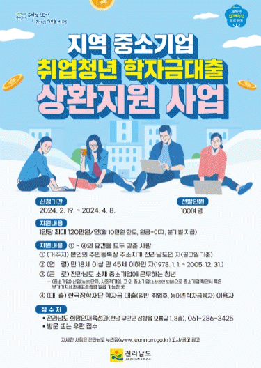[¹Ìµð¾îÀü³² Á¦°¥´ëÁ¾ ±âÀÚ]Àü¶ó³²µµ´Â Áß¼Ò±â¾÷¿¡ Ãë¾÷ÇÑ Ã»³âÀ» ´ë»óÀ¸·Î ÇÐÀÚ±Ý ´ëÃâ »óȯ Áö¿ø ´ë»óÀÚ¸¦ ¿À´Â 4¿ù 8ÀϱîÁö ¸ðÁýÇÑ´Ù°í ¹àÇû´Ù. ½Åû ÀÚ°ÝÀº °ø°íÀÏ(2¿ù19ÀÏ) ±âÁØ Àü³²¿¡ ÁÖ¼Ò¸¦ µÐ ¸¸ 18¼¼ ÀÌ»ó ¸¸ 45¼¼ ÀÌÇÏ Ã»³âÀÌ¡¦