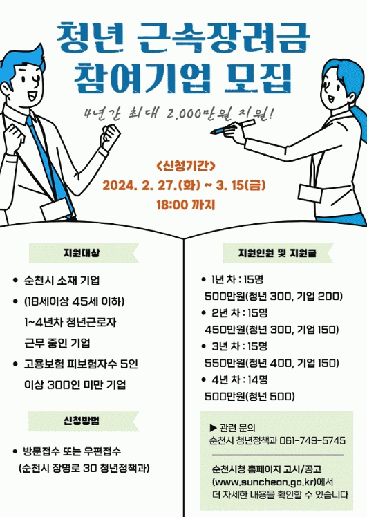 [¹Ìµð¾îÀü³² ÀÓ¼º¿Ï ±âÀÚ]¼øÃµ½Ã°¡ Áß¼Ò±â¾÷¿¡ ÀçÁ÷ ÁßÀΠû³âµéÀÇ Àå±â±Ù¼ÓÀ» À¯µµÇϰí Á¤±ÔÁ÷ ÀÏÀÚ¸® Ãë¾÷ ÃËÁøÀ» À§ÇØ 2024³â û³â ±Ù¼ÓÀå·Á±Ý Áö¿ø»ç¾÷ ¸ðÁýÀ» ½Ç½ÃÇÑ´Ù°í ¹àÇû´Ù. û³â ±Ù¼ÓÀå·Á±Ý Áö¿ø»ç¾÷Àº Áß¼Ò±â¾÷ µî¿¡ Á¤±ÔÁ÷¡¦