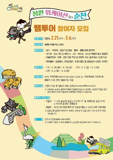 [¹Ìµð¾îÀü³² ÀÓ¼º¿Ï ±âÀÚ]¼øÃµ½Ã´Â ½ÇÈ¿¼º ÀÖ´Â ÇØ¿Ü ¸¶ÄÉÆÃ°ú ¿Ü±¹ÀÎ ´Üü °ü±¤°´ À¯Ä¡¸¦ À§ÇØ ¿À´Â 3¿ù 12ÀϱîÁö ¡®2024³â ¼øÃµ½Ã ÇØ¿Ü´Üü°ü±¤°´ À¯Ä¡ Çù·Â¿©Çà»ç¡¯¸¦ ¸ðÁýÇÑ´Ù°í ¹àÇû´Ù. ½Ã´Â À̹ø Çù·Â¿©Çà»ç °ø¸ð¸¦ ÅëÇØ 2°³ÀÇ ¿©¡¦