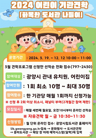 [¹Ìµð¾îÀü³² ÀÓ¼º¿Ï ±âÀÚ]±¤¾çÁ߸¶µµ¼°üÀº Áö¿ª ³» À¯Ä¡¿ø°ú ¾î¸°ÀÌÁýÀ» ´ë»óÀ¸·Î µµ¼°ü °ßÇÐ ÇÁ·Î±×·¥ÀÎ 'ȸñÇÑ µµ¼°ü ³ªµéÀÌ'¸¦ ¿î¿µÇÑ´Ù. µµ¼°ü °ßÇÐ ÇÁ·Î±×·¥Àº ¾î¸± ¶§ºÎÅÍ Ã¥À» °¡±îÀÌÇÏ°í µµ¼°ü°ú Ä£ÇØÁú ¼ö ÀÖ´Â µ¶¼ ½À°ü¡¦