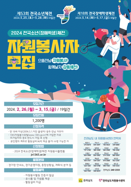 [¹Ìµð¾îÀü³² Á¦°¥´ëÁ¾ ±âÀÚ]Àü¶ó³²µµ´Â ¿À´Â 5¿ù ¿¸®´Â 2024³â Á¦53ȸ Àü±¹¼Ò³âüÀü°ú Á¦18ȸ Àü±¹Àå¾ÖÇлýüÀüÀÇ ¼º°ø °³ÃÖ¸¦ À§ÇØ ÀÚ¿øºÀ»çÀÚ 1õ200¿© ¸íÀ» 3¿ù 15ÀϱîÁö ¸ðÁýÇÑ´Ù°í ¹àÇû´Ù. ±¤ÁÖ¡¤Àü³² °ÅÁÖÀÚ ¸¸ 18¼¼ ÀÌ»ó(2006³â¡¦