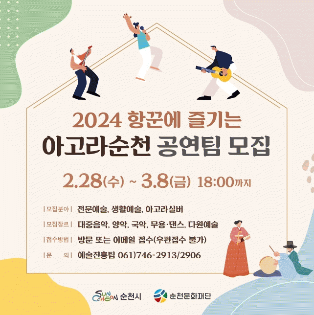 [¹Ìµð¾îÀü³² ÀÓ¼º¿Ï ±âÀÚ](Àç)¼øÃµ¹®ÈÀç´ÜÀº ¿À´Â 28ÀϺÎÅÍ 3¿ù 8ÀϱîÁö¡®2024 Çײۿ¡ Áñ±â´Â ¾Æ°í¶ó ¼øÃµ¡¯¹®È¿¹¼ú °ø¿¬ÆÀÀ» °ø°³ ¸ðÁýÇÑ´Ù°í ¹àÇû´Ù. ¡®¾Æ°í¶ó ¼øÃµ¡¯Àº Áö¿ª ¹®È¿¹¼úÀεéÀÌ Æø³Ð°Ô Âü¿©ÇØ Áö¼ÓÀûÀΠȰµ¿À» ÇÒ ¼ö ÀÖ¡¦