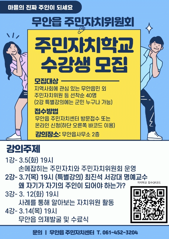 [¹Ìµð¾îÀü³² ±èÆÇ±¹ ±âÀÚ]¹«¾È±º ¹«¾ÈÀ¾ ÁÖ¹ÎÀÚÄ¡À§¿øÈ¸(À§¿øÀå ¾î¼ºÁØ)´Â ¿À´Â 3¿ù 5ÀϺÎÅÍ ÃÑ 4ȸ¿¡ °ÉÃÄ ÁÖ¹ÎÀÚÄ¡Çб³¸¦ ¿î¿µÇÑ´Ù. À̹ø ÁÖ¹ÎÀÚÄ¡Çб³´Â ÁÖ¹ÎÀÚÄ¡¿Í ÀÚÄ¡ºÐ±ÇÀÇ ÀÌÇØÀÇ ÆøÀ» ³ÐÈ÷°í, Áö¿ª Çö¾È ¹ß±¼À» À§ÇÑ ±³À°°ú ÆÀ¡¦