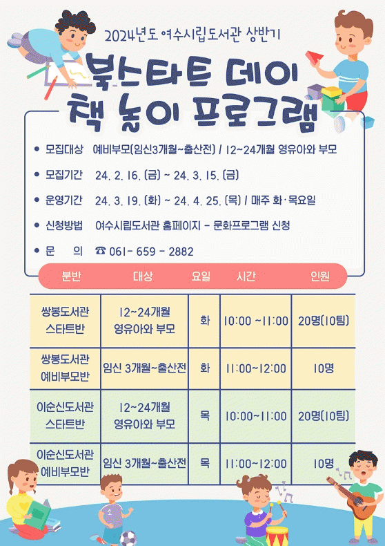 [¹Ìµð¾îÀü³² ÀüÇü¼º ±âÀÚ]¿©¼ö½Ã¸³µµ¼°üÀÌ ³»´Þ 3¿ù 19ÀϺÎÅÍ 4¿ù 25ÀϱîÁö 6ÁÖ°£ ¿µÀ¯¾Æ º¹Áö ¹× µ¶¼À°¾Æ Áö¿øÀ» À§ÇÑ ¡®ºÏ½ºÅ¸Æ® µ¥ÀÌ¡¯¸¦ ¿î¿µÇÑ´Ù. ¡®ºÏ½ºÅ¸Æ® µ¥ÀÌ¡¯´Â ±âÁ¸ ºÏ½ºÅ¸Æ® ±×¸²Ã¥ ²Ù·¯¹Ì ¼±¹°¿¡ ÀÌÀº ÈÄ¼Ó ÇÁ·Î±×·¥À¸¡¦