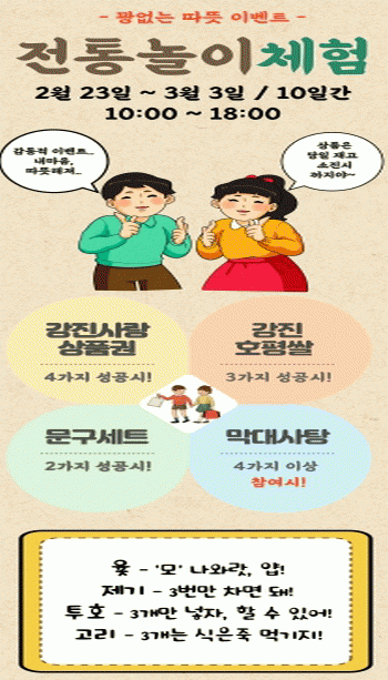 [¹Ìµð¾îÀü³² °í±Ô¼® ±âÀÚ]¿À´Â 2¿ù 23ÀϺÎÅÍ 3¿ù 3ÀϱîÁö 10Àϰ£ °Áø±º ´ë±¸¸é °í·ÁûÀÚ ¿äÁö ÀÏ¿ø¿¡¼ °³ÃֵǴ Á¦52ȸ °ÁøÃ»ÀÚÃàÁ¦±â°£¿¡ °í·ÁûÀÚ¹Ú¹°°ü ¾Õ¿¡¼ ÀüÅë³îÀÌ Ã¼ÇèÇÁ·Î±×·¥ÀÌ ¿î¿µµÈ´Ù. ÃàÁ¦ÀåÀ» ãÀº °ü±¤°´µé¿¡°Ô Çѱ¹¡¦