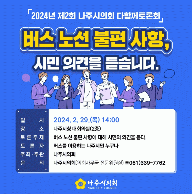 [¹Ìµð¾îÀü³² Á¦°¥´ëÁ¾ ±âÀÚ]³ªÁÖ½ÃÀÇȸ´Â 29ÀÏ 14½Ã, ³ªÁÖ½Ãû ´ëȸÀǽÇ(2Ãþ)¿¡¼ ¡®2024³â Á¦2ȸ ³ªÁÖ½ÃÀÇȸ ´ÙÇÔ²²Åä·Ðȸ¡¯¸¦ °³ÃÖÇÑ´Ù. À̹ø Åä·Ðȸ´Â Áö³ÇØ 10¿ù Àü¸é °³ÆíµÇ¾î ½ÃÇà ÁßÀÎ ¹ö½º ³ë¼±¿¡ °üÇÑ »ý°¢À» ¹ö½º¸¦ ÀÌ¿ëÇϴ¡¦