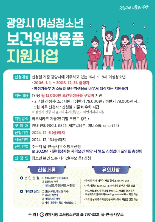 [¹Ìµð¾îÀü³² ÀÓ¼º¿Ï ±âÀÚ]±¤¾ç½Ã´Â ¿©¼ºÃ»¼Ò³âÀÇ °Ç°±Ç º¸Àå°ú ±ÇÀÍÁõÁø ½ÇÇöÀ» À§ÇØ ¡®¿©¼ºÃ»¼Ò³â º¸°ÇÀ§»ý¿ëǰ Áö¿ø»ç¾÷¡¯À» ÃßÁøÇÑ´Ù. Áö¿ø ´ë»óÀº ±¤¾ç½Ã¿¡ °ÅÁÖÇÏ´Â 16¼¼ ºÎÅÍ 18¼¼(2006³â ºÎÅÍ 2008³â Ãâ»ý) ¿©¼ºÃ»¼Ò³âÀ¸·Î, ¾à ¡¦