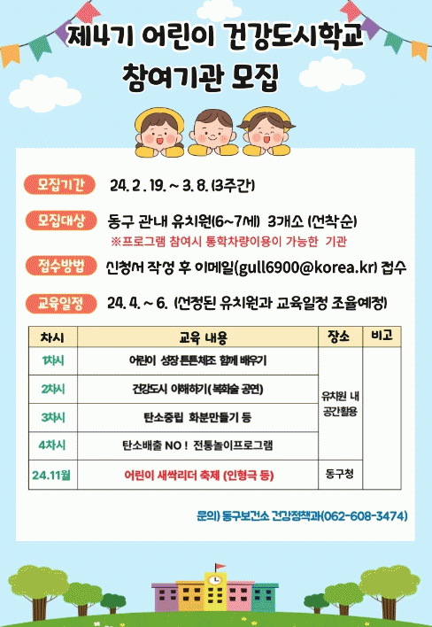 [¹Ìµð¾îÀü³² ±èÁ¤¿ì ±âÀÚ]±¤ÁÖ µ¿±¸´Â ¹Ì·¡ °Ç° µµ½Ã ½ÇÇöÀÇ ÁÖ¿ªÀÌ µÉ ¾î¸°À̸¦ ´ë»óÀ¸·Î ¡®°Ç° µµ½Ã ¾î¸°ÀÌÇб³¡¯ Âü¿©±â°üÀ» ¿À´Â 3¿ù 8ÀϱîÁö ¸ðÁýÇÑ´Ù°í ¹àÇû´Ù. ¡®°Ç°µµ½Ã ¾î¸°ÀÌÇб³¡¯´Â °Ç°ÇÑ »ýȰ ½À°üÀ» ½ÇõÇÏ¸ç ±âÈĺ¯È¡¦