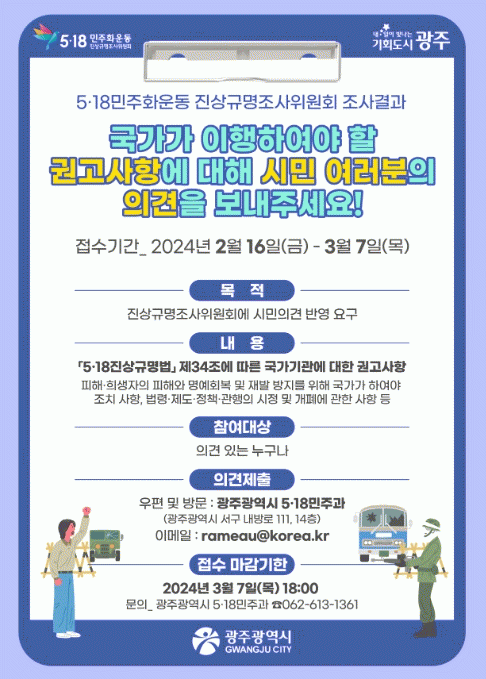 [¹Ìµð¾îÀü³² Á¦°¥´ëÁ¾ ±âÀÚ]±¤ÁÖ±¤¿ª½Ã´Â 5¡¤18¹ÎÁÖȿÁø»ó±Ô¸íÁ¶»çÀ§¿øÈ¸ÀÇ Á¶»ç °á°ú º¸°í¿¡ ¾Õ¼ ±¹°¡ÀÇ ÈÄ¼Ó Á¶Ä¡ ÇÊ¿ä»çÇ׿¡ ´ëÇÑ ½Ã¹Î ÀǰßÀ» ûÃëÇÑ´Ù. Á¶»çÀ§´Â 4³â °£ÀÇ °ø½Ä Á¶»ç¸¦ ¸¶Ä¡°í ¿À´Â 6¿ù Á¾ÇÕº¸°í¼¸¦ ÀÛ¼ºÇØ¡¦