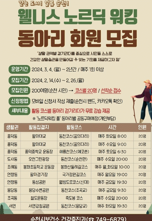 [¹Ìµð¾îÀü³² ÀÓ¼º¿Ï ±âÀÚ]¼øÃµ½Ã´Â Áý°ú Á÷Àå µî »ýȰÅ͸¦ Áß½ÉÀ¸·Î ½Ã¹ÎµéÀÌ ÁÖ 1ȸ ÀÌ»ó ¸ð¿© °È±â·Î °Ç°¼ÒÅëÀ» ÇÒ¼ö ÀÖ´Â ¡®À£´Ï½º ³ë¸£µñ ¿öÅ· µ¿¾Æ¸®¡¯ Âü¿©ÀÚ¸¦ 200¸í ¸ðÁýÇÑ´Ù°í ¹àÇû´Ù. À£´Ï½º ³ë¸£µñ ¿öÅ· µ¿¾Æ¸®´Â 3¿ù 4ÀϺΡ¦