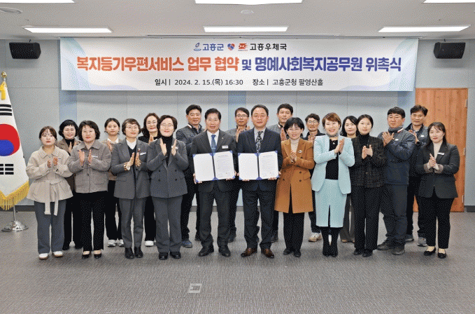[¹Ìµð¾îÀü³² Á¦°¥´ëÁ¾ ±âÀÚ]°íÈﱺÀº Áö³ 15ÀÏ °íÈﱺû ÆÈ¿µ»êȦ¿¡¼ °íÈï¿ìü±¹(±¹Àå ¹Úµ¿¿ø)°ú ¡®º¹Áöµî±â ¿ìÆí¼ºñ½º ¾÷¹« Çù¾à¡¯À» ü°áÇϰí À̳¯ Âü¼®ÇÑ Áý¹è¿ø¿¡°Ô ¸í¿¹ »çȸº¹Áö°ø¹«¿ø À§ÃËÀåÀ» ¼ö¿©Çß´Ù°í ¹àÇû´Ù. ¡®º¹Áöµî±â¡¦