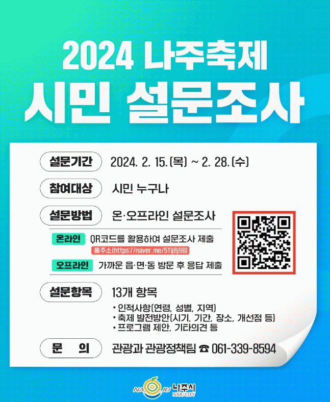 [¹Ìµð¾îÀü³² Á¦°¥´ëÁ¾ ±âÀÚ]Àü¶ó³²µµ ³ªÁֽô ¡®2024 ³ªÁÖÃàÁ¦¡¯ ±âȹ´Ü°èºÎÅÍ ½Ã¹ÎµéÀÇ ´Ù¾çÇÑ ÀǰßÀ» ¼ö·ÅÇϱâ À§ÇØ ¡®½Ã¹Î ¼³¹®Á¶»ç¡¯¸¦ ½Ç½ÃÇÑ´Ù. Áö¿ª»çȸÀÇ ±â´ë¿Í ¿ä±¸¸¦ Àû±Ø ¹Ý¿µÇϱâ À§ÇØ ½Ç½ÃÇÏ´Â À̹ø ¼³¹®Á¶»ç´Â 28ÀϱîÁö¡¦
