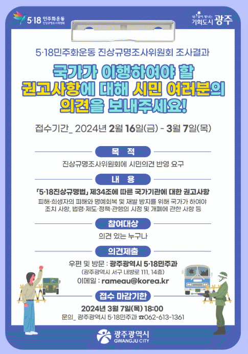 [¹Ìµð¾îÀü³² Á¦°¥´ëÁ¾ ±âÀÚ]±¤ÁÖ±¤¿ª½Ã´Â 5¡¤18¹ÎÁÖȿÁø»ó±Ô¸íÁ¶»çÀ§¿øÈ¸ÀÇ Á¶»ç °á°ú º¸°í¿¡ ¾Õ¼ ±¹°¡ÀÇ ÈÄ¼Ó Á¶Ä¡ ÇÊ¿ä»çÇ׿¡ ´ëÇÑ ½Ã¹Î ÀǰßÀ» ûÃëÇÑ´Ù. Á¶»çÀ§´Â 4³â °£ÀÇ °ø½Ä Á¶»ç¸¦ ¸¶Ä¡°í ¿À´Â 6¿ù Á¾ÇÕº¸°í¼¸¦ ÀÛ¼ºÇØ¡¦