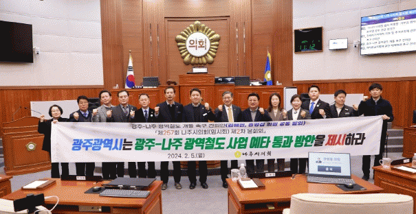 [¹Ìµð¾îÀü³² Á¦°¥´ëÁ¾ ±âÀÚ]³ªÁÖ½ÃÀÇȸ´Â ±èÇØ¿ø, È«¿µ¼· ÀÇ¿øÀÌ °øµ¿ ¹ßÀÇÇÑ ¡®±¤ÁÖ-³ªÁÖ ±¤¿ªÃ¶µµ °³Åë Ã˱¸ °ÇÀǾȡ¯À» 5ÀÏ ¿¸° ³ªÁÖ½ÃÀÇȸ(ÀÓ½Ãȸ) Á¦2Â÷ º»È¸ÀÇ¿¡¼ ÀǰáÇß´Ù. À̹ø °ÇÀǾȿ¡´Â ±¤ÁÖ±¤¿ª½Ã¿¡ ±¤ÁÖ-³ªÁÖ ±¤¿ªÃ¶µµ »ç¡¦