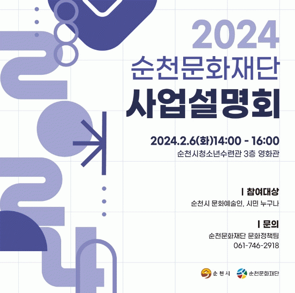 [¹Ìµð¾îÀü³² ÀÓ¼º¿Ï ±âÀÚ](Àç)¼øÃµ¹®ÈÀç´ÜÀº ¿À´Â 6ÀÏ ¿ÀÈÄ 2½ÃºÎÅÍ 4½Ã±îÁö ¼øÃµ½Ã û¼Ò³â¼ö·Ã°ü 3Ãþ ¿µÈ°ü¿¡¼ ¼øÃµ½Ã ¹®È¿¹¼úÀΰú ½Ã¹ÎÀ» ´ë»óÀ¸·Î¡°2024 ¼øÃµ¹®ÈÀç´Ü »ç¾÷¼³¸íȸ¡±¸¦ °³ÃÖÇÑ´Ù°í ¹àÇû´Ù. À̹ø »ç¾÷¼³¸íȸ´Â 2¡¦
