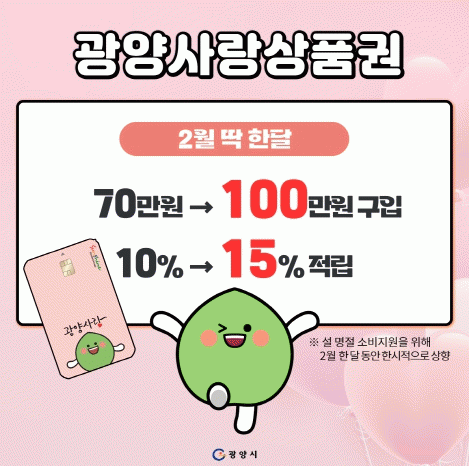 [¹Ìµð¾îÀü³² ÀÓ¼º¿Ï ±âÀÚ]±¤¾ç½Ã°¡ ´Ù°¡¿À´Â ¼³ ¸íÀýÀ» ¸ÂÀÌÇØ ¿À´Â 2¿ù 1ÀϺÎÅÍ 29ÀϱîÁö ÇÑ ´Þ°£ ±¤¾ç»ç¶û»óǰ±Ç ÇÒÀÎÀ²À» 10%¿¡¼ 15%·Î, 1ÀÎ´ç ±¸¸Å Çѵµ¸¦ ¿ù 70¸¸ ¿ø¿¡¼ ¿ù 100¸¸ ¿øÀ¸·Î »óÇ⠿ÇÏ´Â À̺¥Æ®¸¦ ÁøÇàÇÑ´Ù. ½Ã´Â¡¦