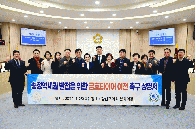 [¹Ìµð¾îÀü³² ±èÁ¤¿ì ±âÀÚ]±¤»ê±¸ÀÇȸ ÀÇ¿ø 15ÀÎ(´õºÒ¾î¹ÎÁִ硤Á¤ÀÇ´ç)ÀÌ ¡®±¤ÁÖ¼ÛÁ¤¿ª¼¼±Ç ¹ßÀüÀ» À§ÇÑ ±ÝȣŸÀÌ¾î ±¤ÁÖ°øÀå ÀÌÀü Ã˱¸ ¼º¸í¼¡¯¸¦ ¹ßÇ¥Çß´Ù. ÀÇ¿øµéÀº 25ÀÏ ¼º¸í¼¸¦ ÅëÇØ ¡°±ÝȣŸÀÌ¾î ±¤ÁÖ°øÀå ÀÌÀü °èȹÀÌ 2018³â ¡¦