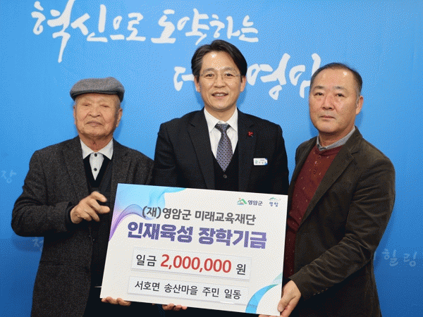 [¹Ìµð¾îÀü³² °í±Ô¼® ±âÀÚ]¿µ¾Ï±º ¼È£¸é ¼Û»ê¸¶À» ÁֹεéÀÇ Æ¯º°ÇÑ ÀåÇÐ±Ý ±âºÎ°¡ ÈÀç´Ù. 9ÀÏ ¼Û»ê¸¶À» ÁֹεéÀº (Àç)¿µ¾Ï±º¹Ì·¡±³À°Àç´Ü¿¡ Áö¿ªÀÎÀç À°¼º¿¡ ½á´Þ¶ó¸ç 200¸¸¿øÀ» ±âŹÇß´Ù. À̵éÀº 2021³âºÎÅÍ À̹ø±îÁö ¼¼ Â÷·Ê¿¡ °É¡¦