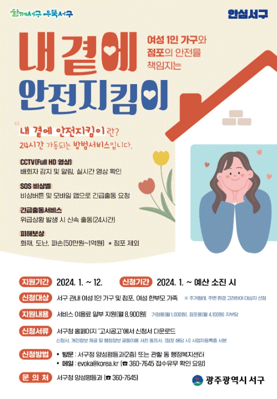 [¹Ìµð¾îÀü³² ±èÁ¤¿ì ±âÀÚ]±¤ÁÖ±¤¿ª½Ã ¼±¸´Â ¿©¼º 1ÀÎ °¡±¸ÀÇ ¹üÁË ¿¹¹æ°ú ¾ÈÀüÇÑ »ýȰȯ°æ Á¶¼ºÀ» À§ÇØ ¾ÈÀüÁöÅ´ÀÌ Áö¿ø»ç¾÷ ´ë»óÀÚ¸¦ ¸ðÁýÇÑ´Ù. ¾ÈÀüÁöÅ´ÀÌ Áö¿ø»ç¾÷Àº ¿òÁ÷ÀÓ °¨Áö ¼¾¼°¡ ³»ÀåµÈ CCTV(Full HD¿µ»ó)¸¦ ÅëÇØ ½Ç½Ã°£À¸·Î¡¦