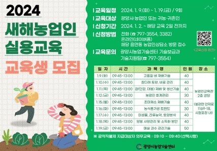 [¹Ìµð¾îÀü³² ÀÓ¼º¿Ï ±âÀÚ]±¤¾ç½Ã´Â ÀÌ´Þ 2ÀϺÎÅÍ ³ó¾÷ÀÎÀÇ »õÇØ ¿µ³ó°èȹ ¼ö¸³°ú ³óÁ¤½ÃÃ¥ È«º¸¸¦ À§ÇÑ ¡®2024³âµµ »õÇØ³ó¾÷ÀÎ ½Ç¿ë±³À°¡¯ ±³À°»ýÀ» ¸ðÁýÇÑ´Ù°í ¹àÇû´Ù. »õÇØ³ó¾÷ÀÎ ½Ç¿ë±³À°Àº ³ó¾÷ȯ°æ º¯È¿¡ µû¸¥ ³ó¾÷Á¤Ã¥ ¿¬°è ±³À°¡¦