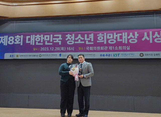 [¹Ìµð¾îÀü³² Á¦°¥´ëÁ¾ ±âÀÚ]Àü¶ó³²µµÀÇȸ ±âȹÇàÁ¤À§¿øÈ¸ ¹Ú¿øÁ¾ ÀÇ¿ø(´õºÒ¾î¹ÎÁÖ´ç, ¿µ±¤1)ÀÌ 12¿ù 28ÀÏ Á¦8ȸ ´ëÇѹα¹ û¼Ò³âÈñ¸Á´ë»óÀ» ¼ö»óÇß´Ù. ´ëÇѹα¹ û¼Ò³âÈñ¸Á´ë»óÀº »ç´Ü¹ýÀÎ Çѱ¹Ã»¼Ò³âÀç´Ü¿¡¼ ÁÖ°üÇϸç û¼Ò³â ½É»ç´Ü ¡¦