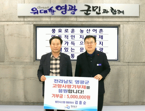 [¹Ìµð¾îÀü³² Á¦°¥´ëÁ¾ ±âÀÚ]¹üÁø½Ã½ºÅÛ ±èÈï¼ø ´ëÇ¥°¡ Áö³ 27ÀÏ ¿µ±¤±ºÀ» ¹æ¹®ÇÏ¿© °íÇâ»ç¶û±âºÎ±Ý ÃÖ°í¾×ÀÎ 5¹é¸¸ ¿øÀ» ±âºÎÇÏ¿© ¿µ±¤±º °íÇâ»ç¶û±âºÎ¿¡ µ¿ÂüÇß´Ù. ¼³¸³ 34³â°¸¦ ¸ÂÀÌÇÑ ¹üÁø½Ã½ºÅÛÀº ÀÚµ¿³»ó, ½½·§, ȯ±â½Ã¼³, Á¾°è¡¦